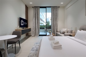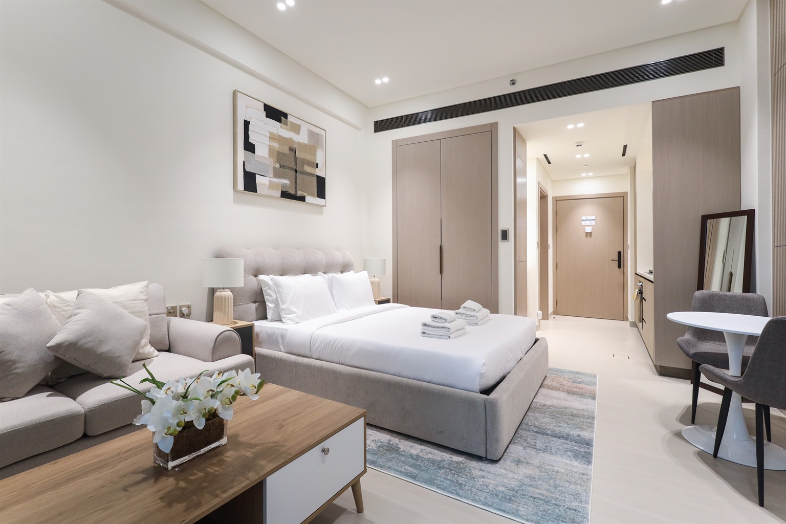 The main living area is smartly laid out to create both relaxation and usability. A comfortable queen-sized bed ensures restful nights, while the cozy sofa and coffee table provide the perfect corner to unwind. The dining table doubles as a practical workspace for remote work or casual meals.