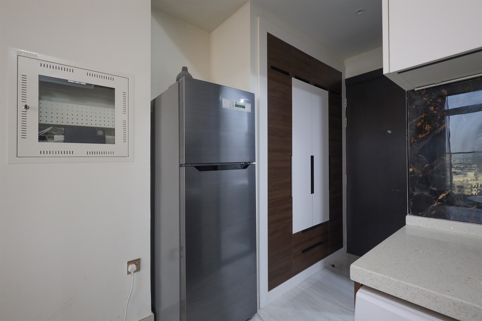 The main living area is smartly arranged to maximize space and comfort. A luxurious king-size bed promises restful nights, while the dining table creates the perfect setting for meals, remote work, or coffee breaks. A Smart TV and high-speed Wi-Fi ensure seamless entertainment and productivity throughout your stay.